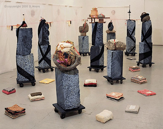 Odyssey Installation, Trentino Marble, photo on silk, mixed media, grandmotherâ²s artifacts, 6.5â²x15â²x30â², 1997