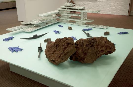 Between Two Shores, 2011 Tra Due Sponde Plexiglas, wood, glass block, lava stone, iron, Venetian Plaster, gloves, acrylic 51 x 108 x 108 in. Courtesy of the artist Photo Credit - Rick Odell