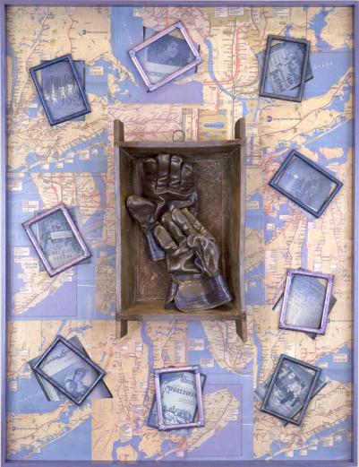 Roots (for Montefalcione), 2011 Radici Street maps Naples/NY, bronzed gloves, artifacts from Montefalcione, Italy and sheet music images 38 x 29 x 2.25 in. Images courtesy of E.Rossi & Co., Charles Sant'Elia Courtesy of the artist Photo Credit - Rick