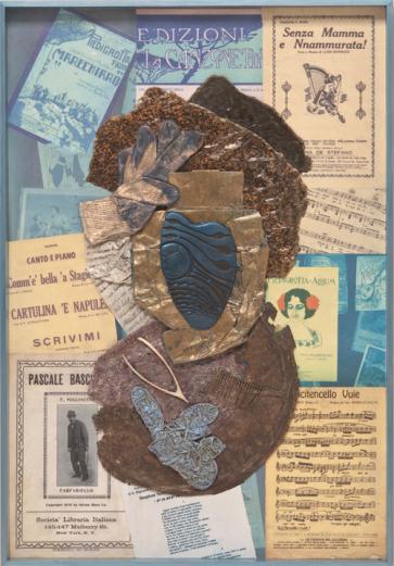 Heart of Naples/Hands of New York, 2011 Cuore di Napoli/Mani di New York Streetmade paper, gloves, found objects (Naples/NY) and sheet music images 22.5 x 32.5 x 2.25 in. Images courtesy of Center for Migration Studies, E.Rossi & Co., Stefania Rinaldi,