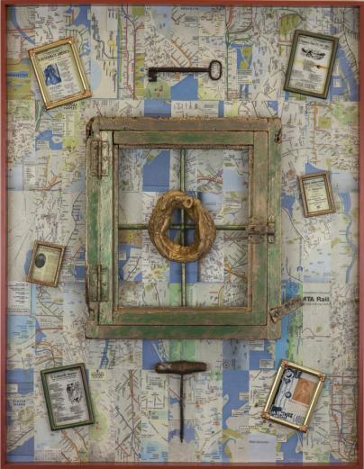 Window to a Wider World (for Montefalcione), 2011 Fensta a o munno cchi granne Street maps Naples/NY, plaster, window and artifacts from Montefalcione, Italy and sheet music images 38 x 29 x 2.25 in. Images courtesy of Center for Migration Studies Cour