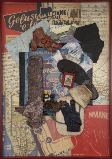 Holding the Street in my Hands, 2011 Sti Mmane Streetmade paper, gloves, found objects (Naples/NY) and sheet music images 22.5 x 32.5 x 2.25 in. Images courtesy of John D. Calandra Italian American Institute, Queens College (CUNY), Stefania Rinaldi Cour