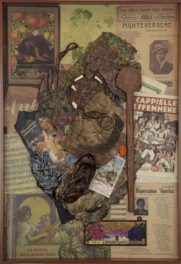 Place of the Heart (for Lapio), 2011 Luogo del cuore (per Lapio) Streetmade paper, bronzed gloves, found objects (Naples/NY), artifacts from Lapio, Italy and sheet music images 22.5 x 32.5 x 2.25 in. Images courtesy of Center for Migration Studies, E.Ro