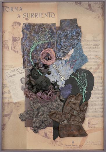 Return to the Stones of Naples, 2011 Torna ai Pietrini Streetmade paper, bronzed gloves, found objects (Naples/NY) and sheet music images 22.5 x 32.5 x 2.25 in. Images courtesy of E. Rossi & Co., Stefania Rinaldi Courtesy of the artist Photo Credit - Ri