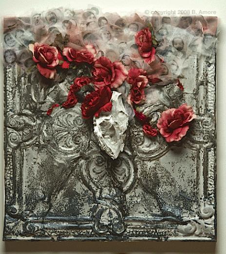 Heart of the Matter II, tin, photo on organza, silk flowers, bone,wood, 24″x24″x5″ 2007